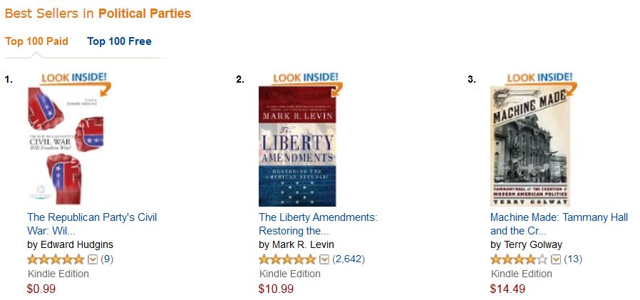 Over the past severn days, during a crowd-sourced marketing campaign, the book rocketed up over 377,000 notches in the Amazon charts to lodge at #1 in the Kindle national bestseller list in "Political Parties," edging out titles by Ann Coulter, Mark Levin, Bob Woodward, Glenn Greenwald, and Charlie Crist. The book is hovering between the number 1 and 2 slots and also landed as #2 in the "Political Philosophy" category, right next to #1: Atlas Shrugged. It also has held the #2 slot in the "all books" "Political Parties" category, which includes hardbacks, paperbacks, audiobooks, and Kindle books. The purpose of the campaign is to increase the visibility and "discoverability" of the book within the crowded Amazon marketplace which offers over 2 million Kindle books.
