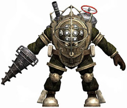 The macabre nature of the splicers, the sickly green tinge that the seawater gives to the light, the melancholy jazz, the flood of black water, and the rubbish of a decaying city combine to create a mood that is an evocative mix of film noir and horror. But all that is mere background to the centerpiece of Bioshock’sgame-play: the player’s confrontations with the “Big Daddies” and the “Little Sisters.”